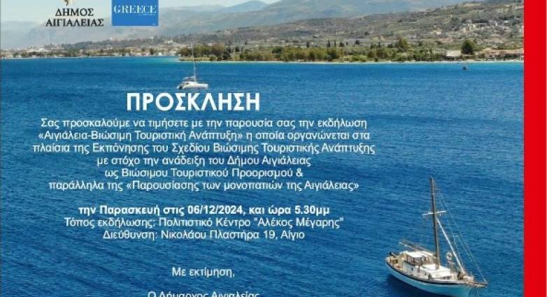Την Παρασκευή 6 Δεκεμβρίου 2024 στο Πολιτιστικό Κέντρο «Αλέκος Μέγαρης», Νικολάου Πλαστήρα 19, στο Αίγιο, στις 17:30 διοργανώνεται ανοιχτή εκδήλωση. Στο πρώτο μέρος της εκδήλωσης θα γίνει η παρουσίαση του Σχεδίου Βιώσιμης Τουριστικής Ανάπτυξης & Branding του Δήμου Αιγιάλειας» από την EURICON ΕΠΕ, Σύμβουλος Διαχείρισης και Ανάπτυξης Προορισμού. Στο δεύτερο μέρος θα γίνει η παρουσίαση των μονοπατιών του Δήμου Αιγιάλειας από την εταιρεία “Μονοπάτια της Ελλάδας ή Paths of Greece”. Κάθε μέρος της εκδήλωσης συνοδεύεται από συζήτηση και τοποθετήσεις των συμμετεχόντων. H εκδήλωση είναι ανοιχτή σε τοπικούς φορείς αλλά και σε κάθε ενδιαφερόμενο.