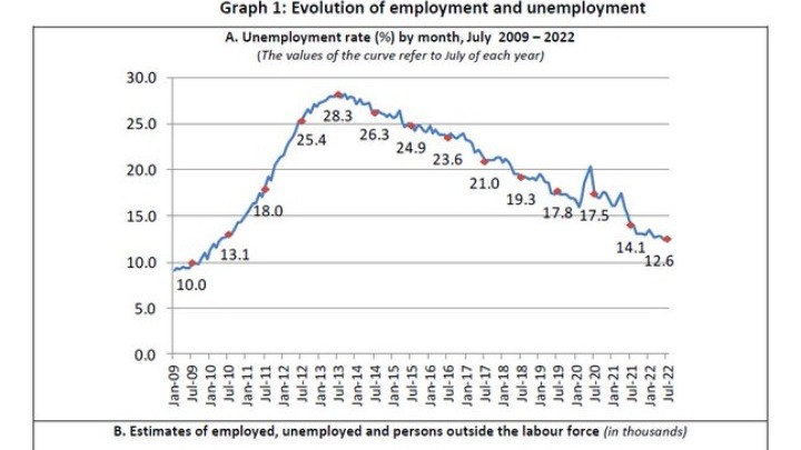 Στο 12,6% διαμορφώθηκε το ποσοστό της ανεργίας στη χώρα τον Ιούλιο εφέτος, έναντι του αναθεωρημένου προς τα κάτω 14,1% τον Ιούλιο 2021 και του αναθεωρημένου προς τα άνω 12,3% τον Ιούνιο 2022. Οι άνεργοι ανήλθαν σε 591.209 άτομα σημειώνοντας μείωση κατά 63.165 άτομα σε σχέση με τον Ιούλιο 2021 (9,7%) και αύξηση κατά 10.509 άτομα σε σχέση με τον Ιούνιο 2022 (1,8%).