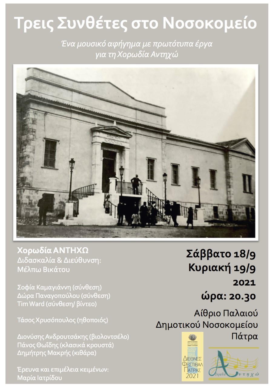 Στο πλαίσιο των εκδηλώσεων του Διεθνούς Φεστιβάλ Πάτρας, παρουσιάζεται στον χώρο του Παλαιού Δημοτικού Νοσοκομείου το μουσικό αφήγημα «Τρείς συνθέτες στο Νοσοκομείο», το οποίο περιλαμβάνει έργα γραμμένα ειδικά για τη χορωδία «Αντηχώ» και πρωτότυπη μουσική, σε συνδυασμό με videoart και αφήγηση. Η χορωδία «Αντηχώ» είχε προσκαλέσει σε συνεργασία τους συνθέτες προκειμένου να μοιραστεί με το κοινό καινούριες μουσικές εμπειρίες και συναισθήματα μέσα από μια σύγχρονη μουσική γραφή.